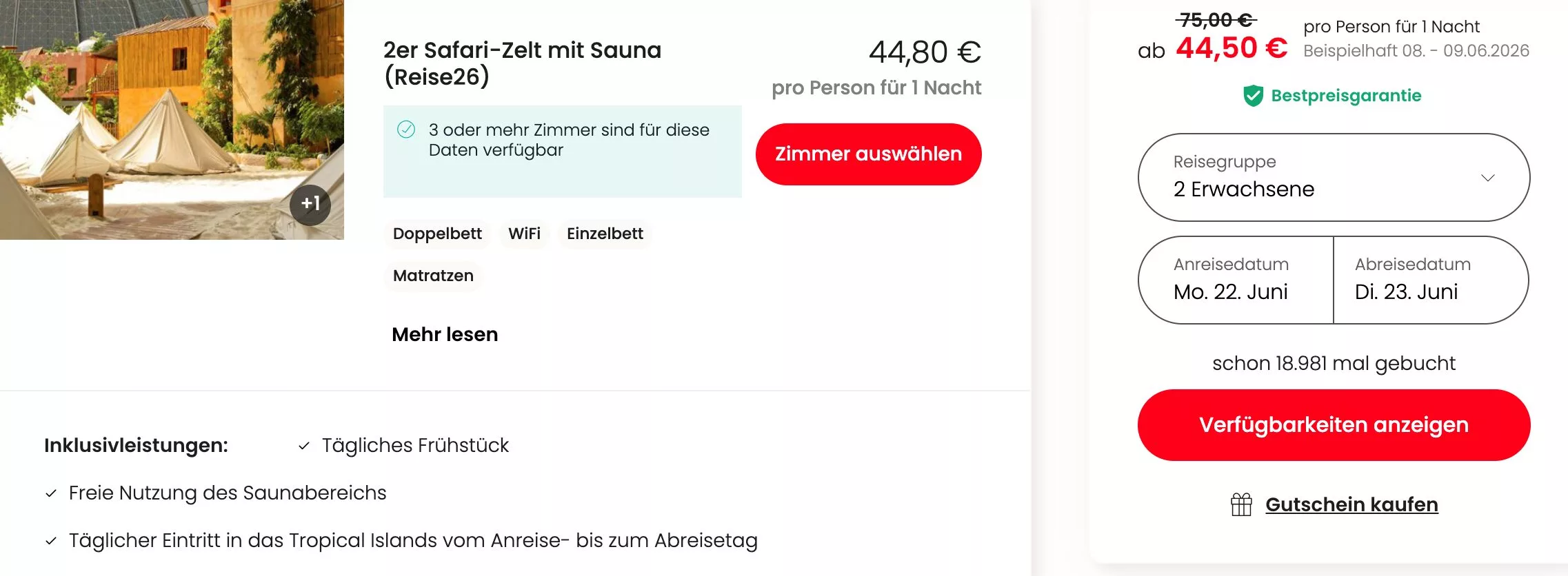 Der tägliche Eintritt ins Tropical Islands ist vom Anreise- bis zum Abreisetag inklusive. Je nach gewählter Zimmerkategorie ist auch die freie Nutzung des Saunabereichs enthalten.