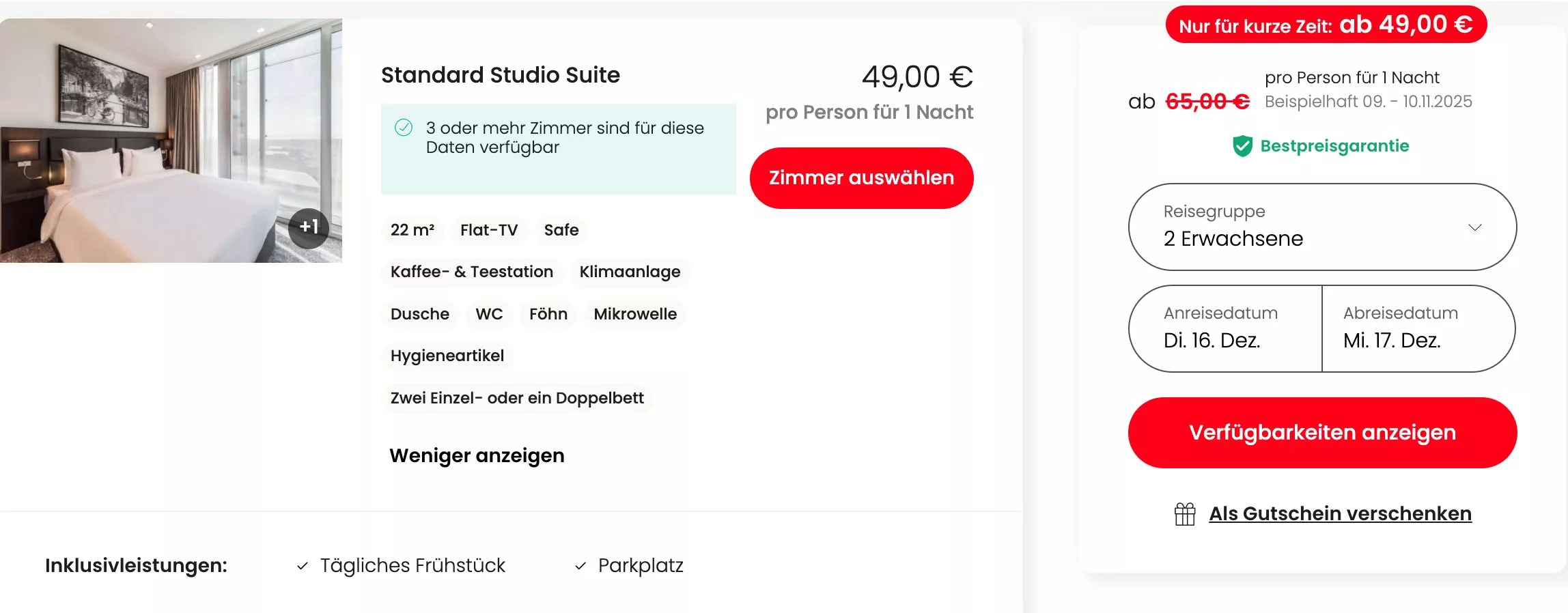 2 Tage in einer Studio Suite mit Kochnische ✔️ Frühstück ist inklusive ✔️ Gratis Parkplatz am Hotel